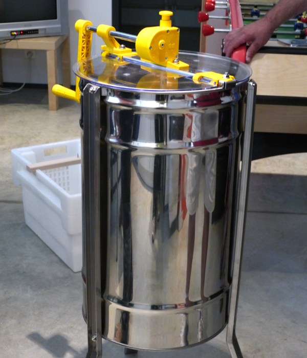 JP has been tooling-up and amassing the requisite tackle, to be co-owned by us and new crew member, Vincent. The key piece of machinery is the Extractor. This is a drum, containing three cages, each of which will hold a frame. Ours is hand powered, the handle is turned to start the frames spinning, and the honey is driven from the cells by centrifugal force.