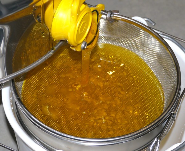 The technique however is soon refined, and the first three frames loaded into the extractor. This is put into motion, and the honey starts to pool at the base of the extractor.