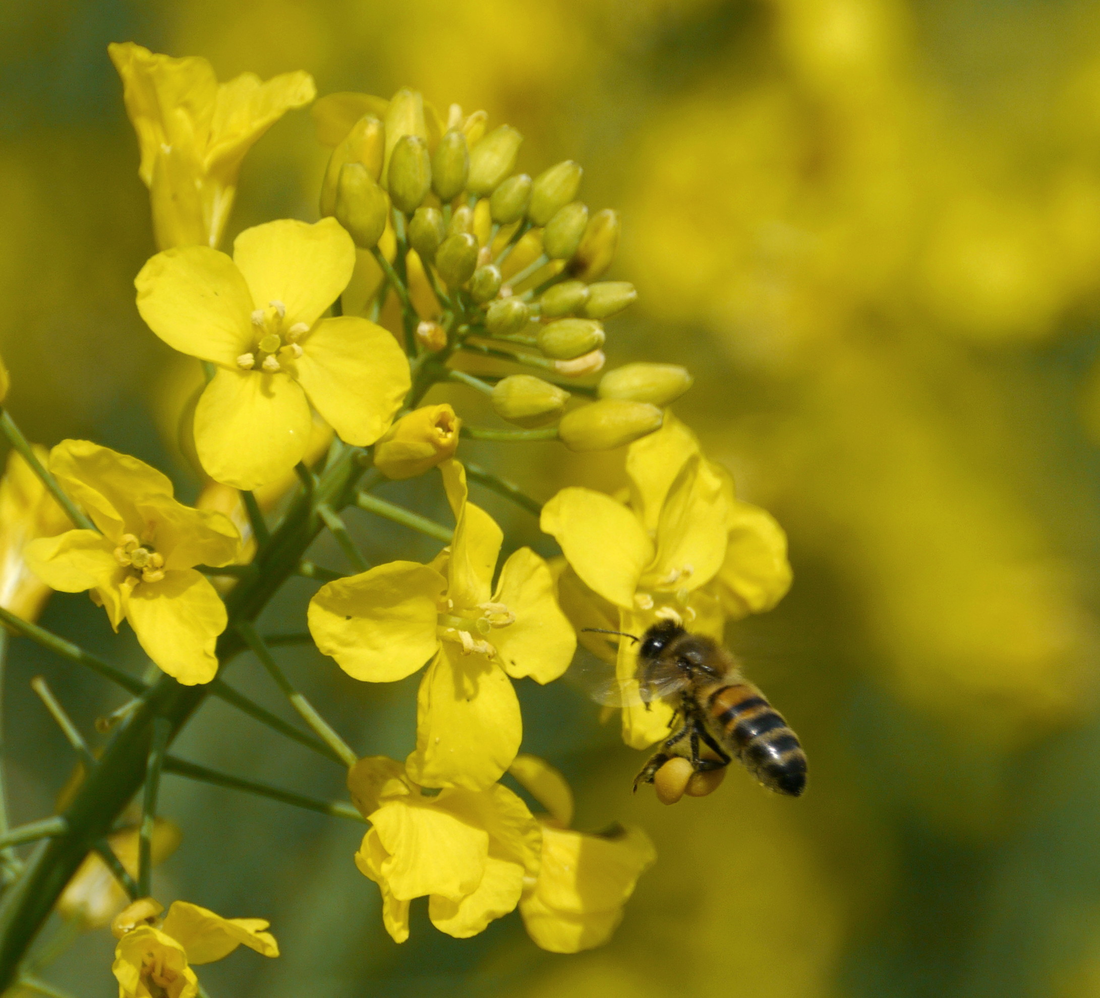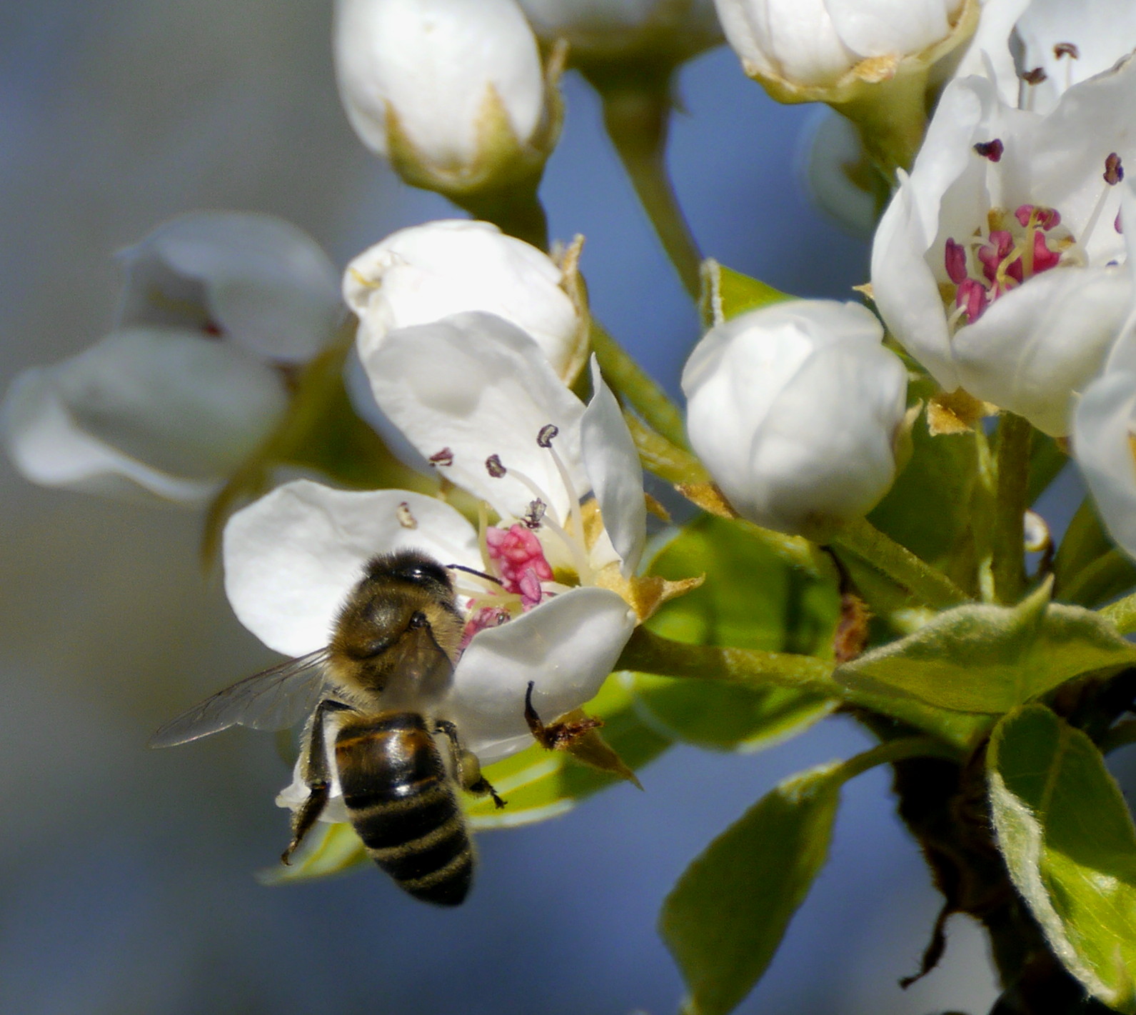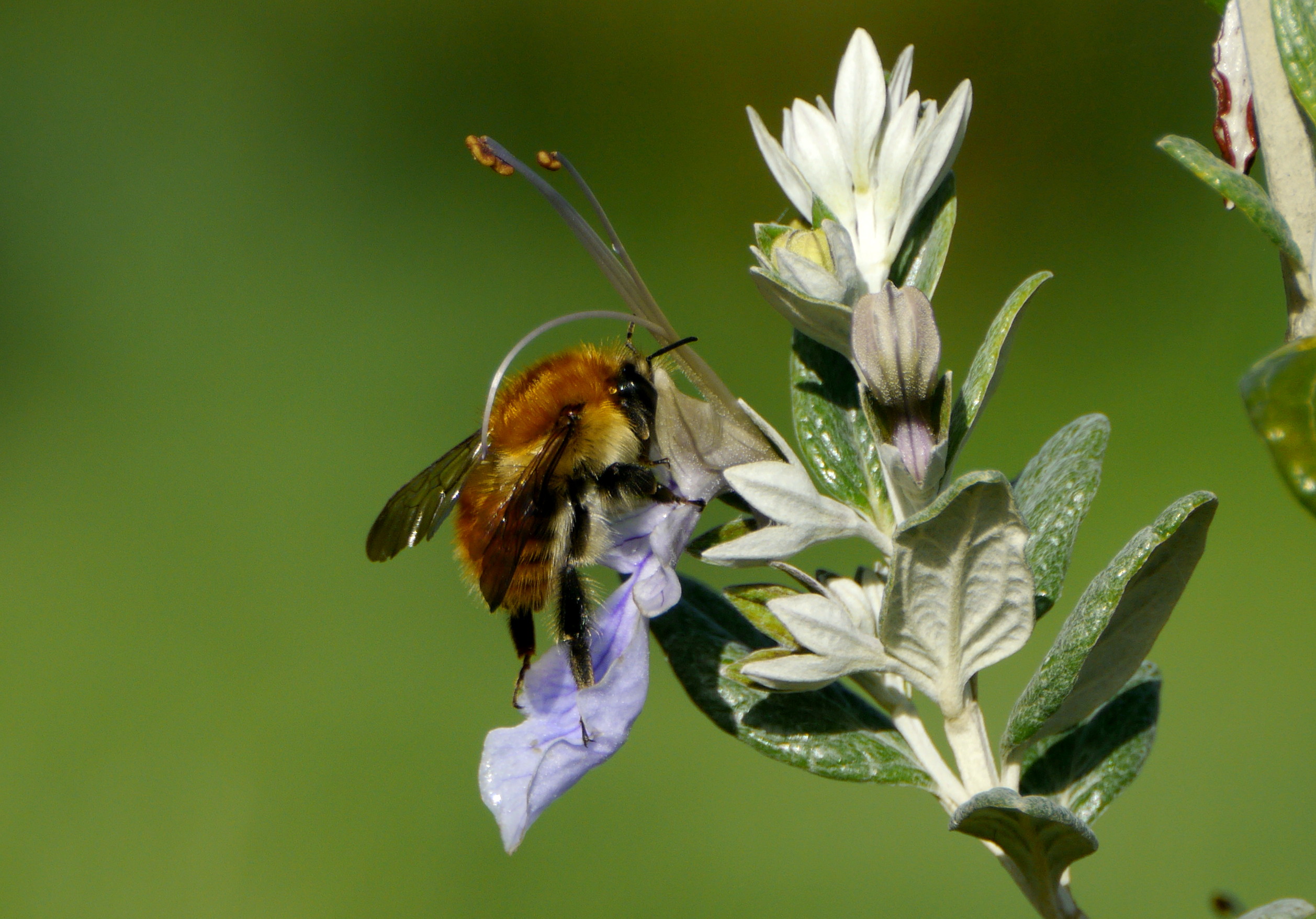 At dawn, there was a sharp heavy downpour, which cleared quickly, followed by a bright blue sky, fresh, not a breath of wind. Out on the early morning dog walk, I noticed that the raindrops had stayed fat and heavy on the flowers and foliage – plus the sun was now glinting off and through them. Dog walk cut short, I dashed back for the camera, this time not anticipating much in the way of bee shots, but potential for trying something new with the sparkling rain drops.