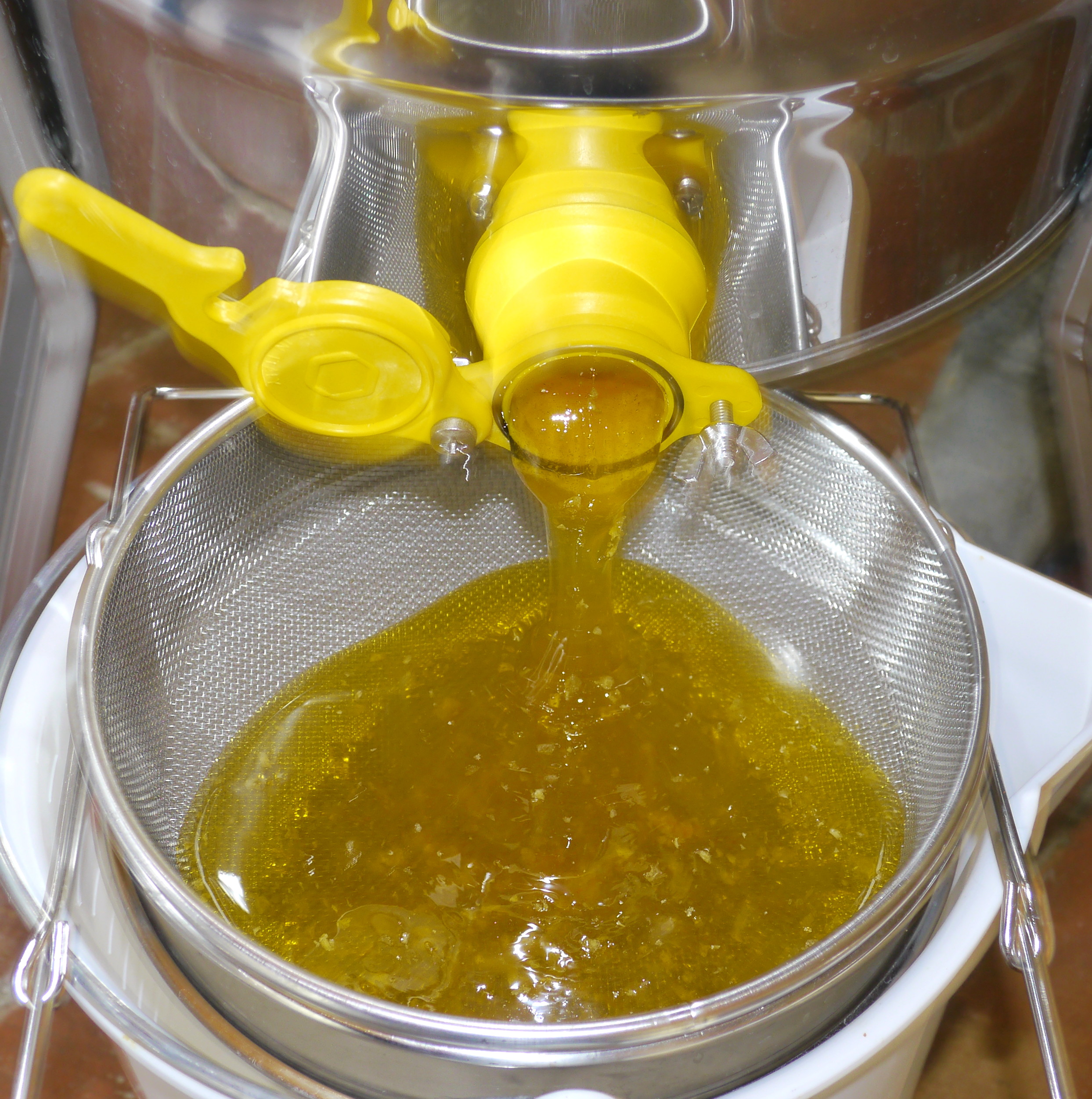 After sieving, to remove bits of wax, the honey is then poured into another plastic tub, to be left to settle. Except for a jar or two for immediate consumption.